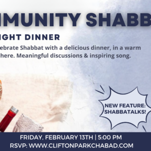 Community Shabbat Community Shabbat ✨🍷 Join us for a beautiful Shabbat experience filled ... 13 - 14 Feb 5:00 pm