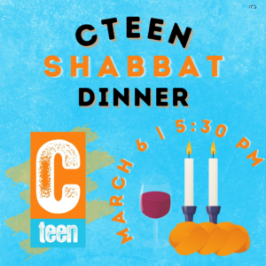 CTeen Shabbat Dinner Teens! Join us for a fun and delicious evening! Celebrating Shabbat, CTeen ... 06 Mar 5:30 pm