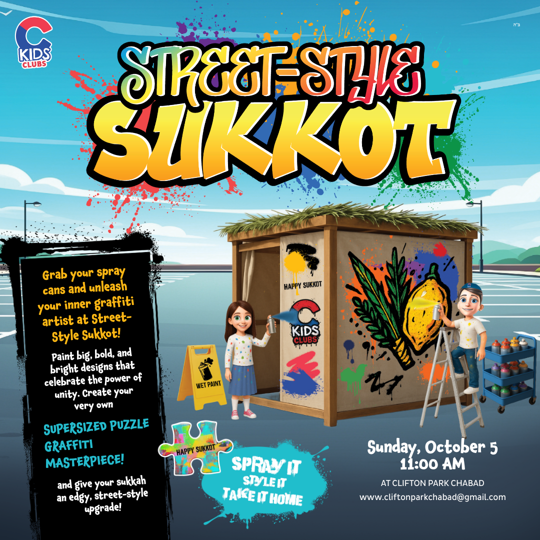 Grab your spray cans and unleash your inner graffiti artist at Clifton Park Chabad’s Street-Style Sukkot! Kids will get to paint bold, bright, and creative designs that celebrate the power of unity while helping create a supersized puzzle graffiti masterpiece.
