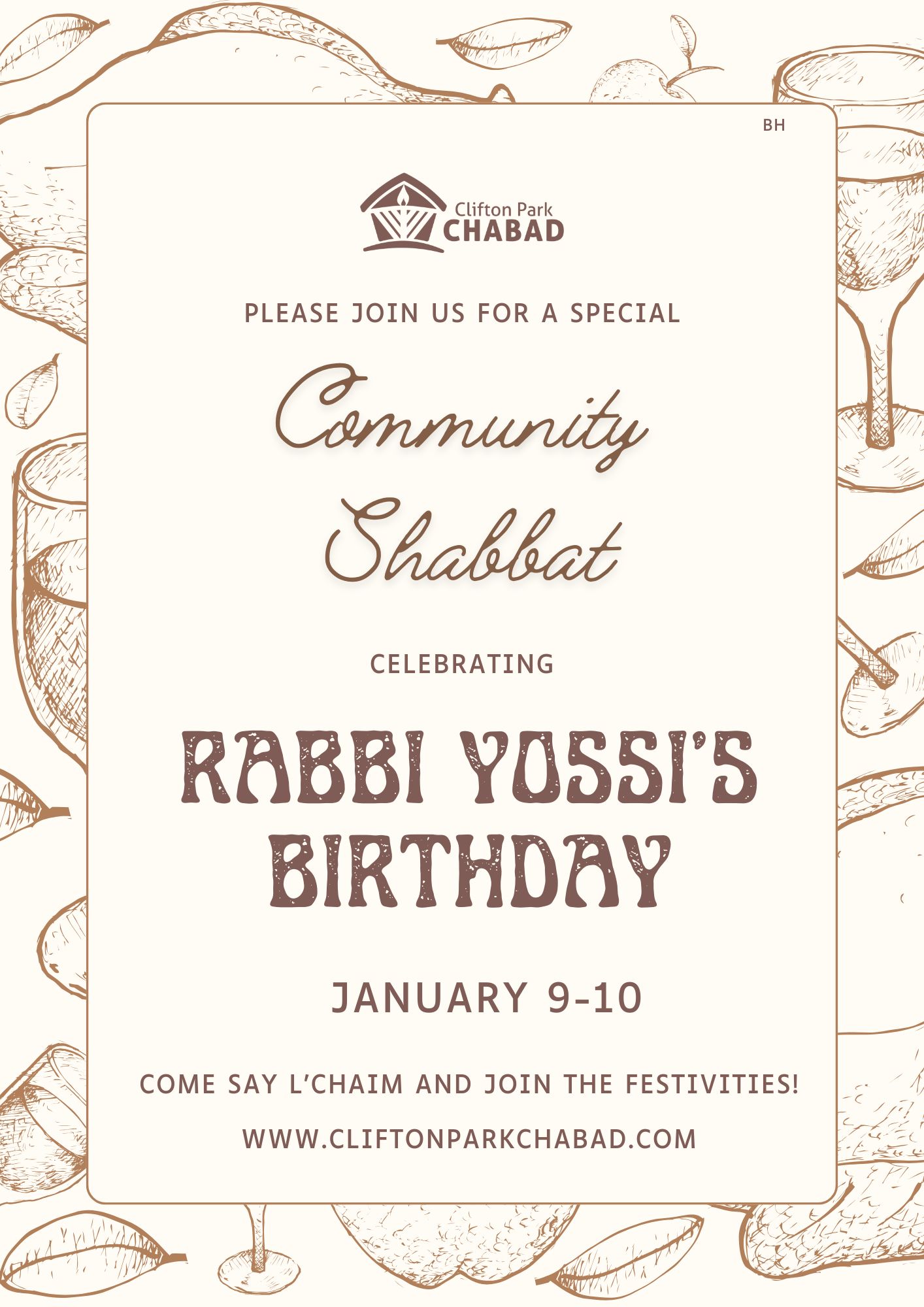 🎉🍷 Community Shabbat — Celebrating Rabbi Yossi’s Birthday! 🍷🎉📅 January 9–10 Raise a L’chaim and join us for a special Community Shabbat filled with joy, warmth, and togetherness as we celebrate Rabbi Yossi’s birthday! Expect uplifting davening, heartfelt moments, and a beautiful Shabbat atmosphere surrounded by community and friends. Everyone is welcome—come celebrate, connect, and be part of something meaningful. We can’t wait to celebrate with you!