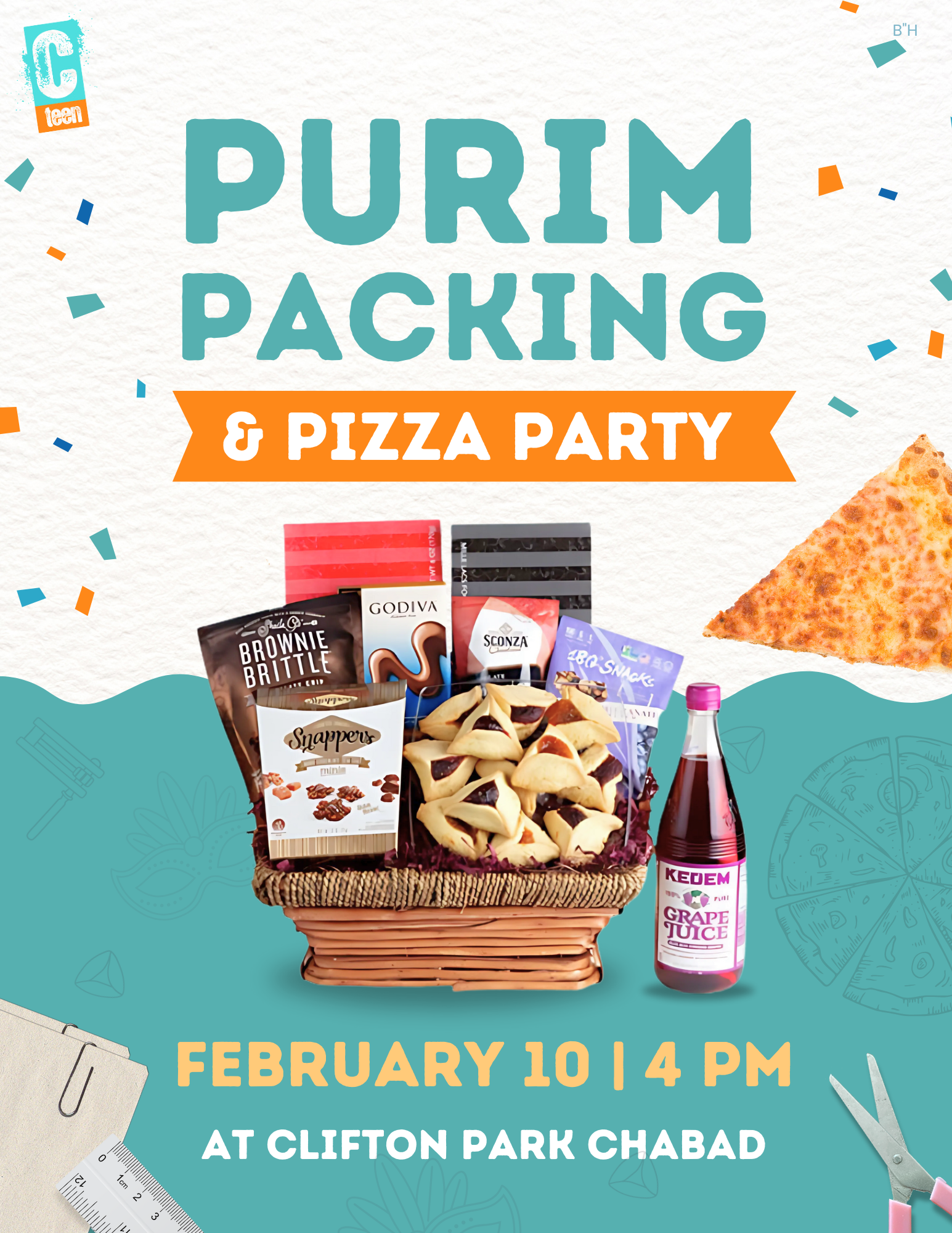 Join us for a fun and meaningful afternoon as we pack Purim gift baskets together and enjoy a pizza party at Clifton Park Chabad.