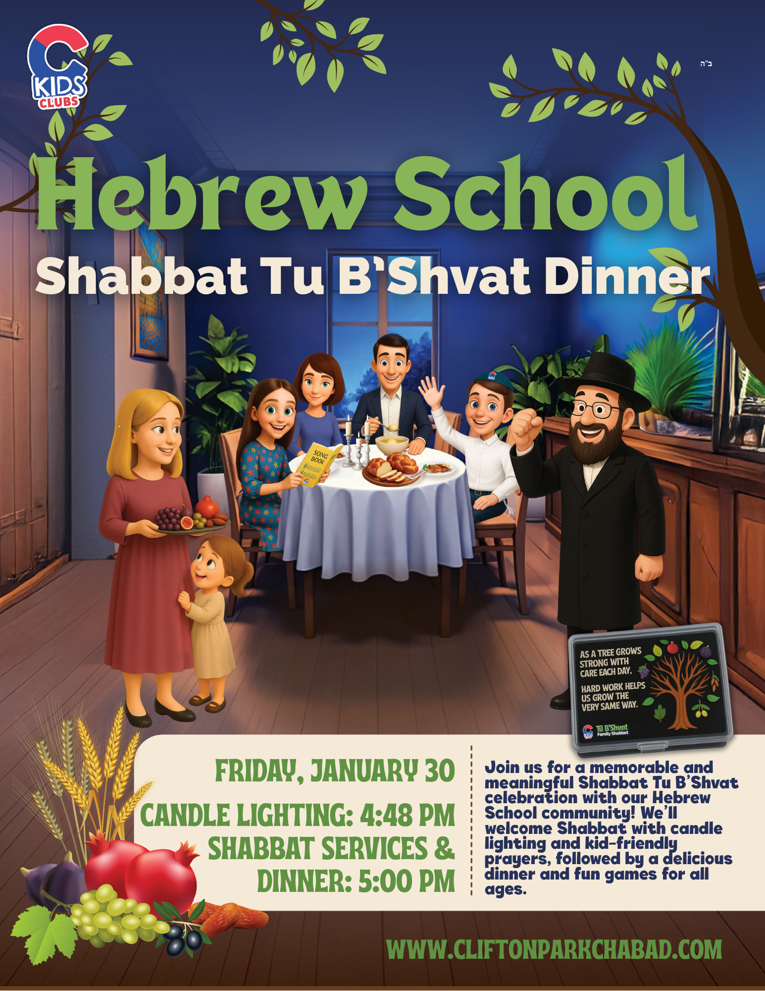 This special evening blends the warmth of Shabbat with the spirit of Tu B’Shvat—perfect for families, friends, and children of all ages.