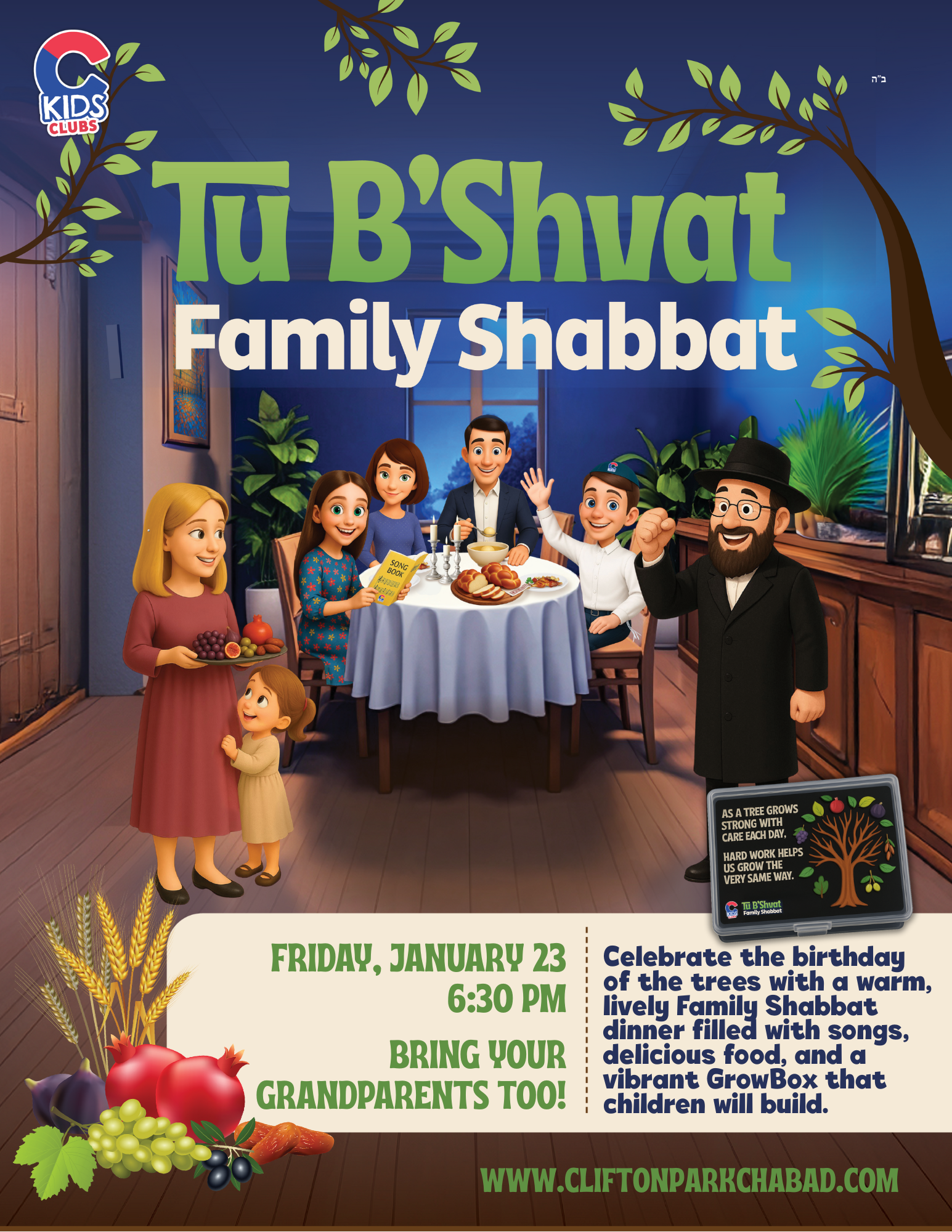 Celebrate the Birthday of the Trees with a warm, lively Family Shabbat Dinner at Clifton Park Chabad! Enjoy a beautiful Shabbat experience filled with songs, delicious food, and meaningful moments for the whole family.